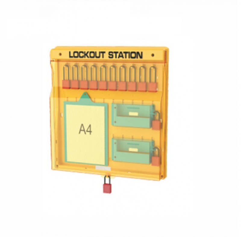 Станция закрытого типа для хранения LOTO замков с прозрачной крышкой. Вмещает 10-20 навесных замков, 1 планшет для бумаги формата А4, 2 кармана для мобильных телефонов. Изготовлена из прочного пластика, закрывается на навесной замок. Станцию без крышки можно заказать под артикулом BD-B210W.