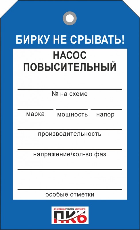 Информационная бирка "Насос повысительный". Изготовлена из пластика ПВХ, толщиной 0,3 мм, без ламинации, диаметр отверстия 7 мм. По желанию заказчика толщина бирки может быть увеличена до 1-2 мм. Нанесение текста необходимо производить маркером или шариковой ручкой. Размер 70 х 115 х 0,3 мм.